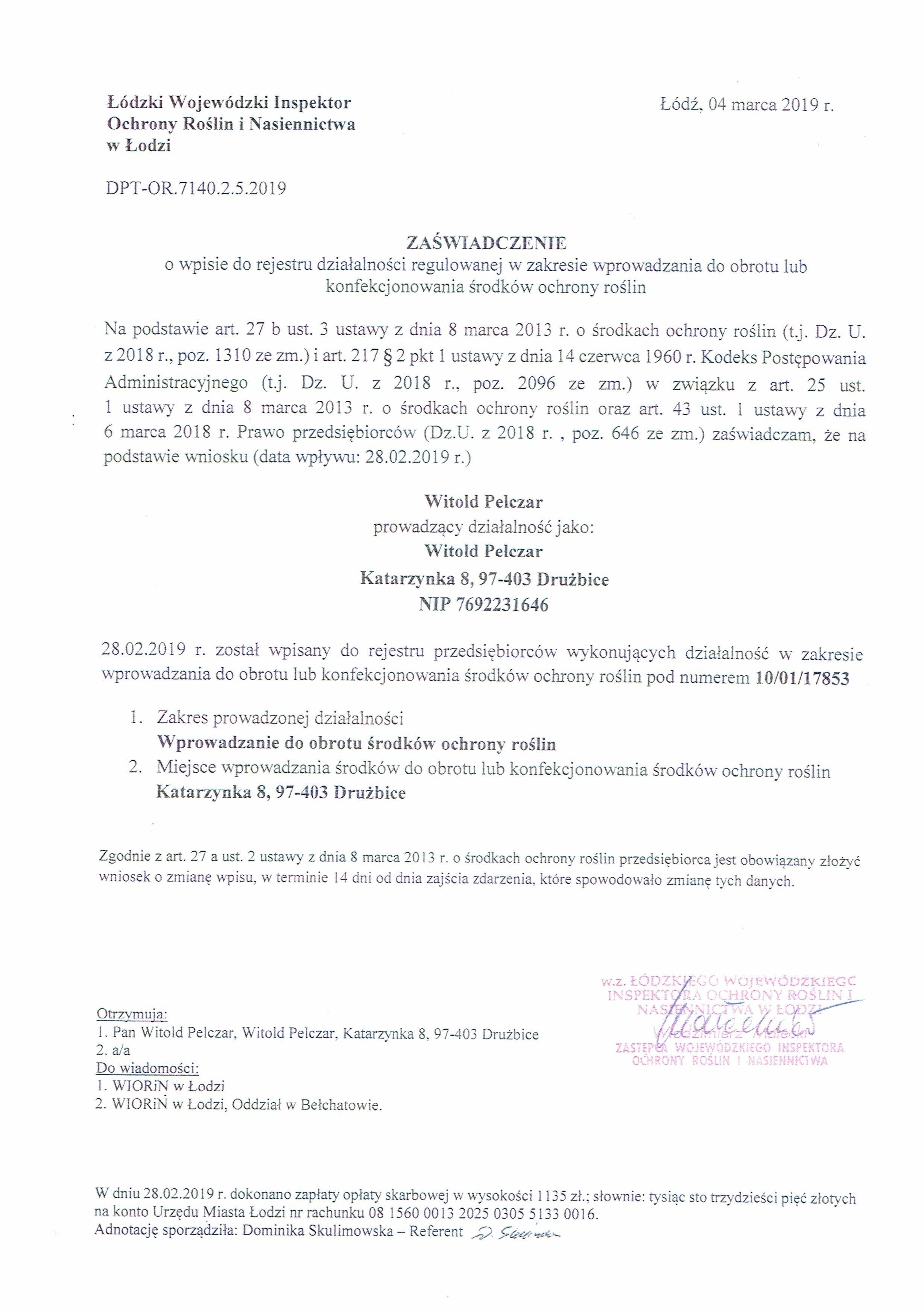 Numer wpisu do rejestru WIORiN przedsiębiorcy wykonującego działalność gospodarczą w zakresie wprowadzania do obrotu środków ochrony roślin 10/01/17853