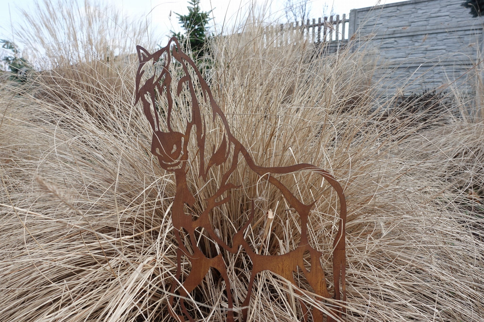 Wykonany z trwałego metalu, płaski koń pokryty jest warstwą rdzy, co nadaje mu rustykalny wygląd. Nie wymaga dodatkowego zabezpieczenia i jest idealny do użytku na zewnątrz, bez względu na warunki atmosferyczne.