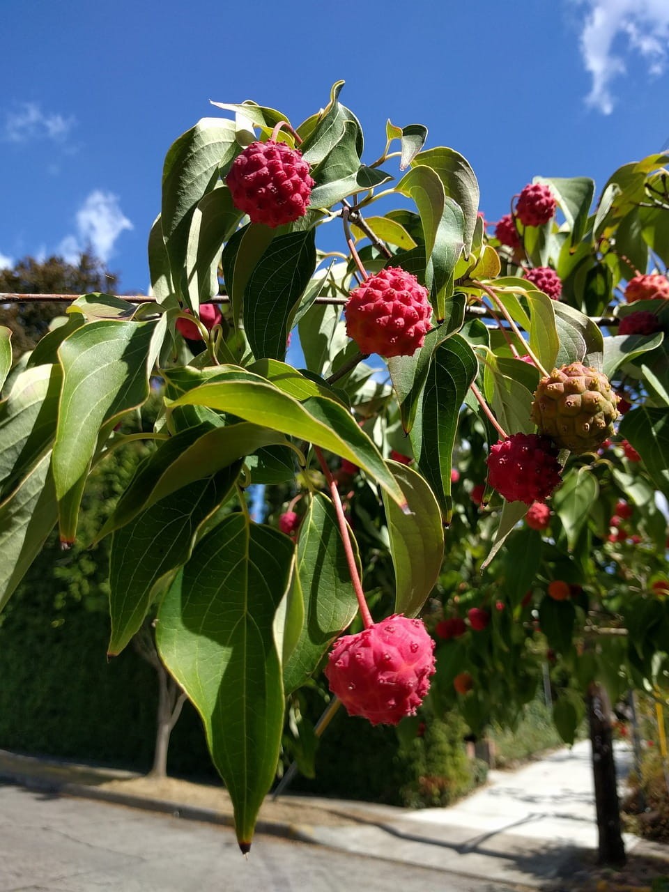 Fantastyczny krzew ozdobny, pochodzący z Azji, o fantazyjnym, nieregularnym pokroju i powolnym tempie wzrostu. Dorasta do 3 m wysokości i 2 m szerokości. Liście faliste, ciemnozielone, jesienią zmieniające barwę na czerwono-pomarańczowo-żółtą, opadają na zimę. Latem roślina pokrywa się licznymi, drobnymi kwiatami, zebranymi w główkowate kwiatostany. Fenomenalną ozdobą krzewu są jednak duże, biało-kremowe, ostro zakończone, zebrane po 4 pod każdym kwiatem podsadki kwiatowe, które opadają po przekwitnięciu kwiatów. Jesienią z kwiatów wykształcają się bajeczne, czerwone, jadalne, owoce, kształtem przypominające truskawkę lub malinę, niezbyt smaczne. Świetnie nadają się na przetwory. Preferuje miejsca słoneczne lub półcieniste, dobrze rośnie na glebie żyznej, umiarkowanie wilgotnej, może to być ziemia uniwersalna ogrodowa, pH 5,5-6,5; najlepiej wymieszać ją z perlitem lub keramzytem, co spowoduje lepsze dotlenienie korzeni, a tym samym bujniejszy wzrost. Ten niezwykle oryginalny krzew wprowadzi w każdym ogrodzie elegancję i niepowtarzalny charakter! Idealnie sprawdzi się posadzony jako soliter, w ogrodach przydomowych, na skwerach oraz w parkach, gdzie jego piękne kwiaty i atrakcyjne owoce mogą być w pełni docenione. Rośliny uprawiane w donicach sadzimy w ogrodach przez cały sezon wegetacyjny, tj. od wczesnej wiosny, poprzez lato, aż do późnej jesieni.