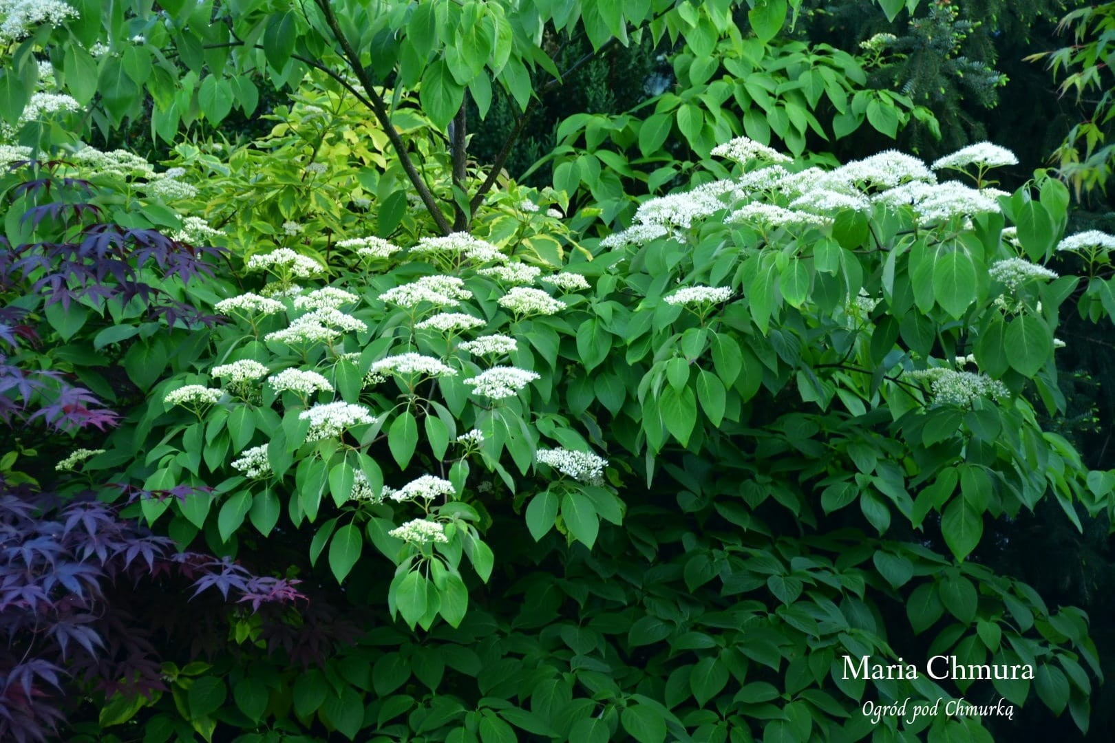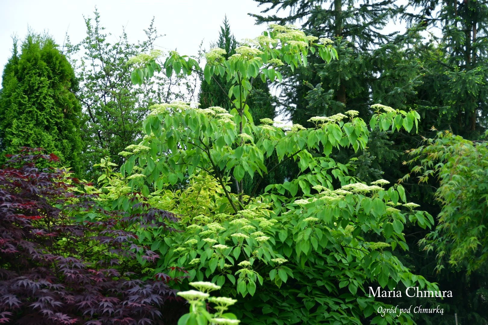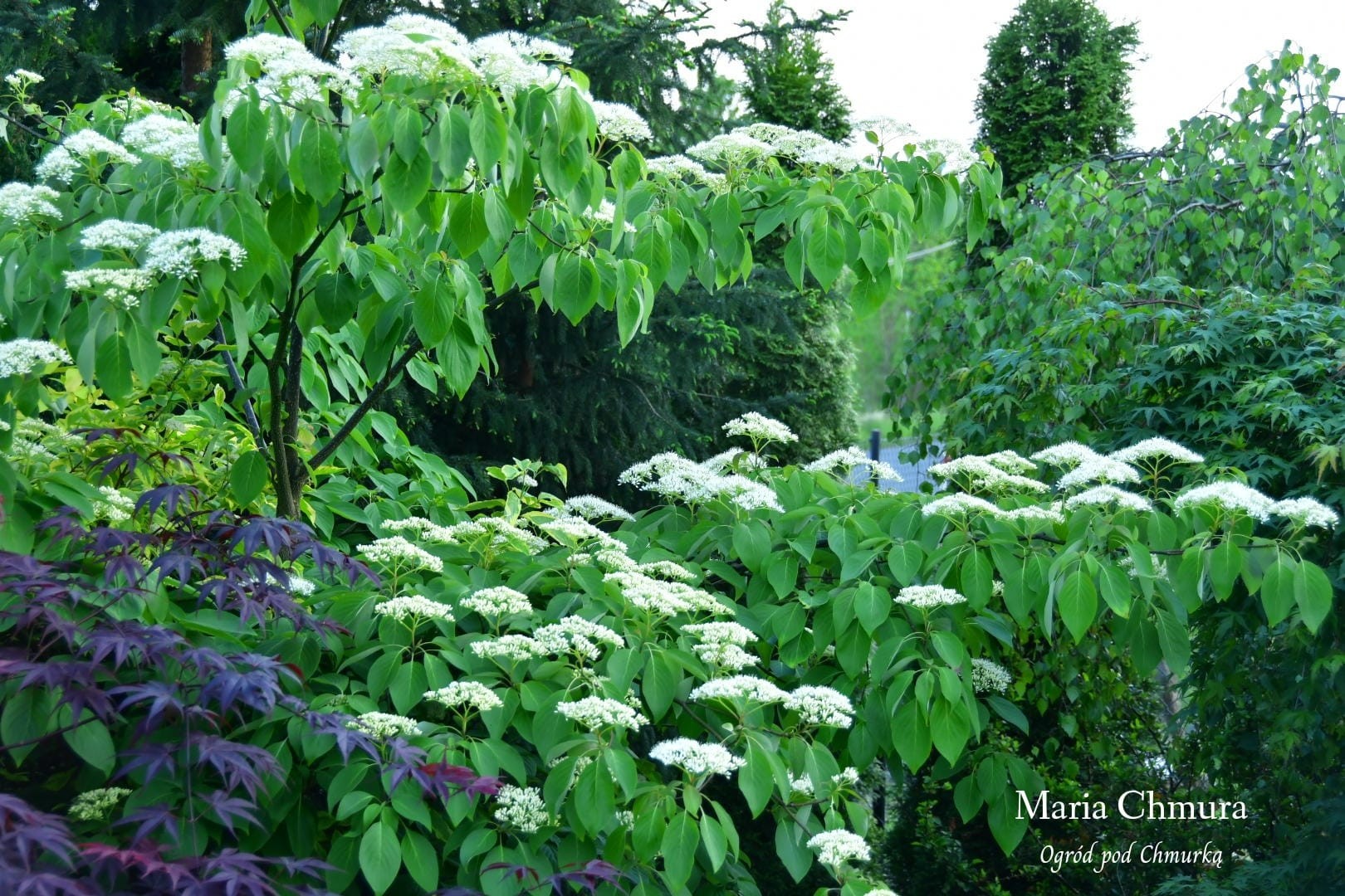 Niezwykle dekoracyjna, rzadko spotykania odmiana derenia o wzniesionym pokroju. Docelowo dorasta do 7 m wysokości i 6 m szerokości. Cechą charakterystyczną są rozrastające się poziomo gałęzie, tworzące fantastycznie wyglądające piętra. Liście błyszczące ciemnozielone, od spodu szare. Jesienią przebarwiają się czerwono-fioletowo, i długo utrzymują się na drzewku, co jest dodatkowym atutem. Kwitnie wiosną, wówczas obsypany jest delikatnie pachnącymi kremowobiałymi, gwiazdkowatymi kwiatami zebranymi w płaskie baldachy. Wczesną jesienią w miejsce kwiatów pojawiają się owoce w postaci drobnych, granatowych jagód. Preferuje miejsca słoneczne do półcienistych, dobrze rośnie na glebie żyznej, przepuszczalnej o odczynie lekko kwaśnym, może to być ziemia uniwersalna ogrodowa o pH 5,5-,6,5; najlepiej wymieszać ją z perlitem, co spowoduje lepsze dotlenienie korzeni, a tym samym bujniejszy wzrost. Młode egzemplarze warto na zimę okryć, starsze są całkowicie mrozoodporne. Oryginalne, przepiękne drzewo, najlepiej prezentuje się jako soliter w wyeksponowanych miejscach. Polecany również do ogrodów japońskich i naturalistycznych. Rośliny uprawiane w donicach sadzimy w ogrodach przez cały sezon wegetacyjny, tj. od wczesnej wiosny, poprzez lato, aż do późnej jesieni.