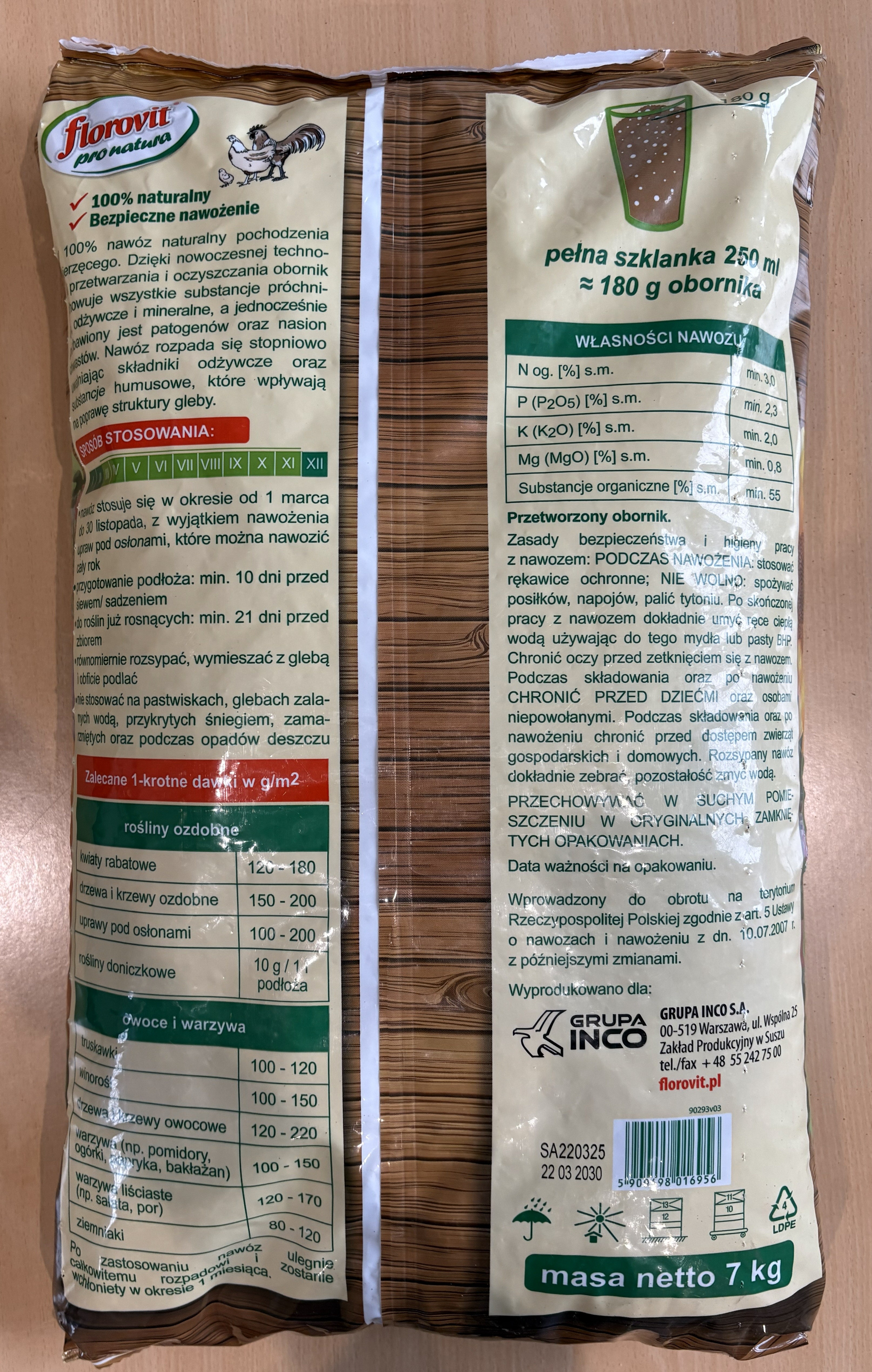 - Ogrodnictwo i rolnictwo ekologiczne – Florovit Obornik Kurzy jest idealnym wyborem do nawożenia wszelkich roślin ogrodowych, takich jak warzywa, kwiaty, drzewa owocowe, krzewy ozdobne, a także trawniki.