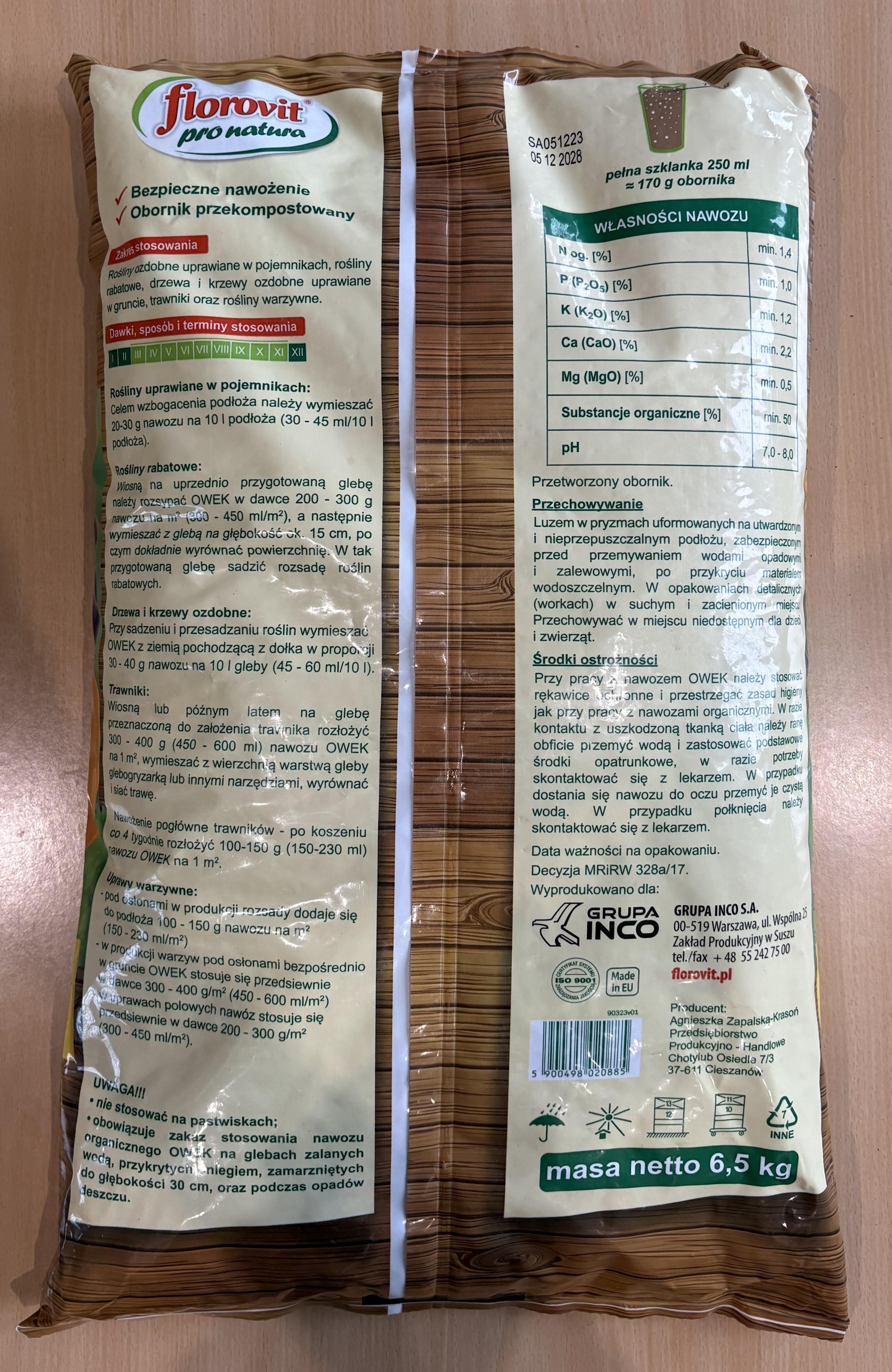 Florovit obornik owczy to niezawodny sposób na zdrowie Twoich roślin i gleby. Organiczny skład i stopniowe uwalnianie składników odżywczych zapewnia roślinom optymalny rozwój, poprawia strukturę gleby, a także sprzyja jej długotrwałej żyzności. Brak szkodliwych substancji i naturalny skład sprawiają, że jest bezpieczny zarówno dla roślin, jak i dla środowiska.