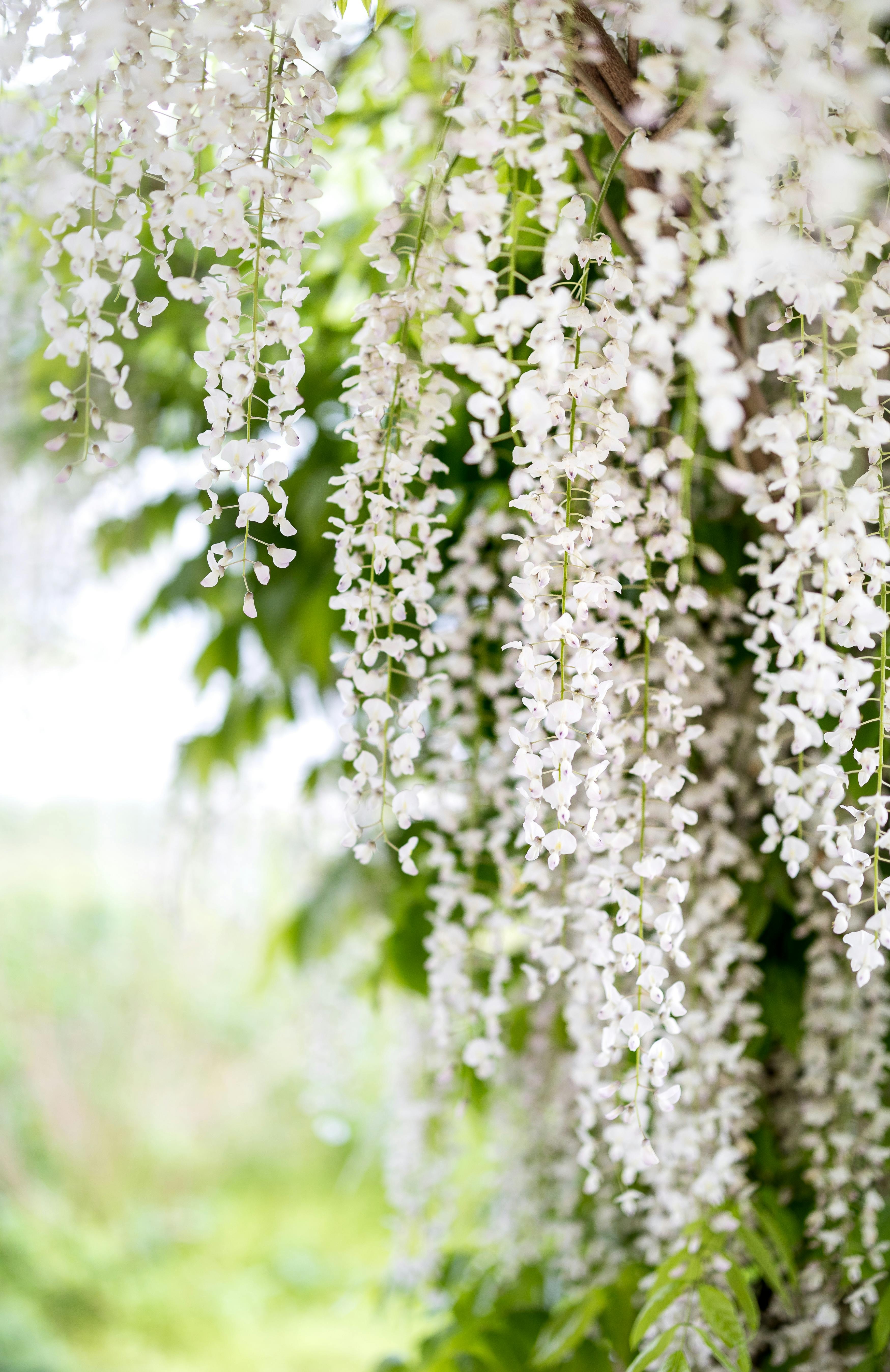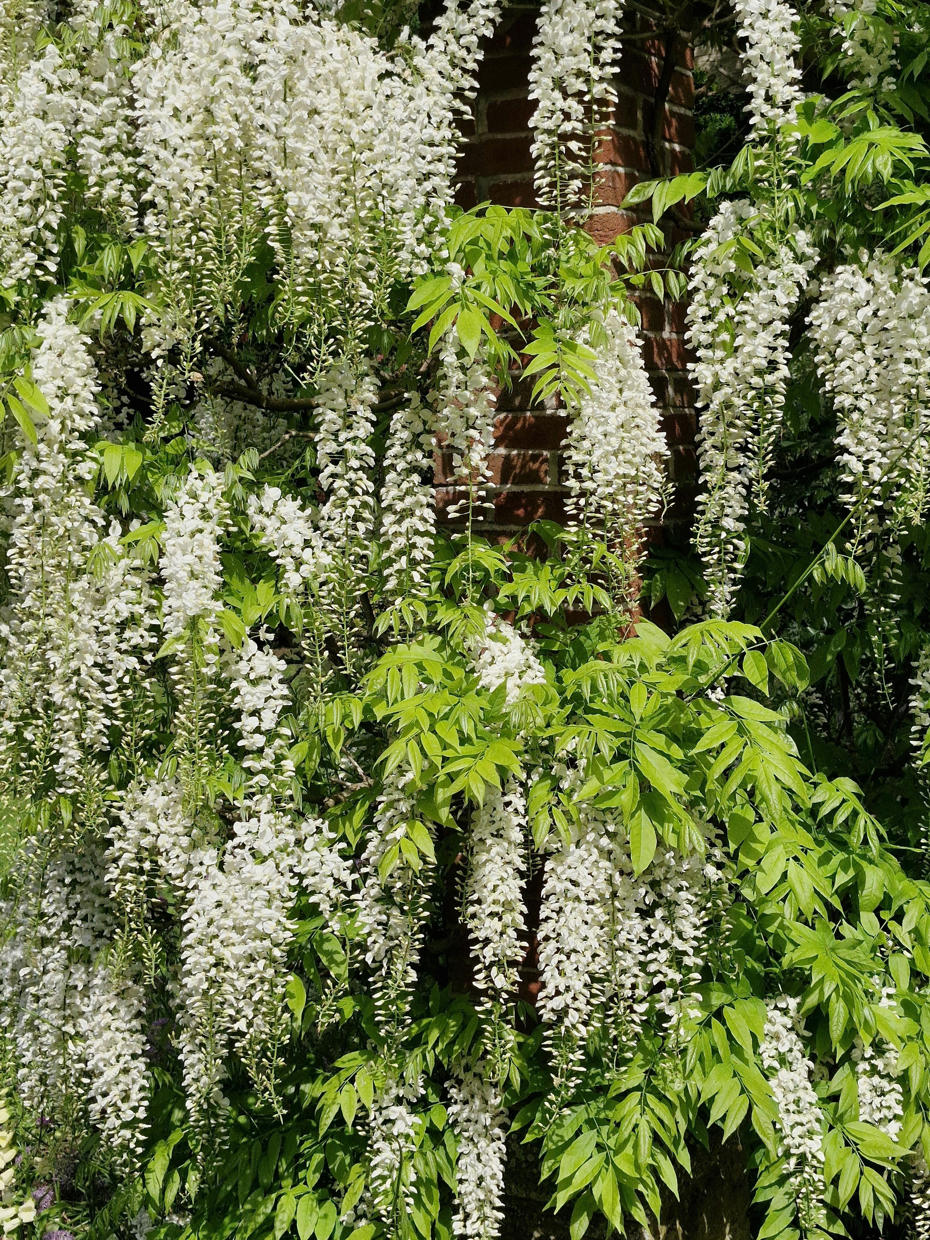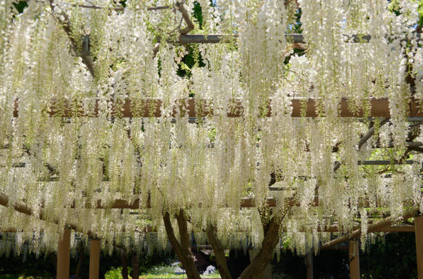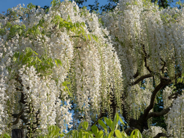 Bajkowa kaskada białych kwiatów, która zamienia ogród w miejsce pełne lekkości i elegancji. Rośnie silnie i szybko, po 10 latach osiągając nawet 10 metrów wysokości i 4 metry szerokości, dzięki czemu bez trudu potrafi okryć pergolę, altanę lub ogrodowy mur. Młode liście początkowo mają delikatnie brązowawy odcień, z czasem stają się soczyście zielone, a jesienią przebarwiają się na ciepłe, złociste barwy, subtelnie domykając sezon. Od maja do czerwca, roślina obsypuje się długimi, zwisającymi gronami śnieżnobiałych, motylkowatych kwiatów, które tworzą spektakularny widok i wypełniają przestrzeń delikatnym, kojącym zapachem. Po kwitnieniu pojawiają się dekoracyjne, omszone strąki, utrzymujące się aż do wiosny i dodające roślinie uroku również poza sezonem kwiatowym. Preferuje stanowiska zaciszne i słoneczne. Wymaga gleb żyznych, umiarkowanie wilgotnych i próchniczych, o lekko kwaśnym odczynie, może to być ziemia uniwersalna ogrodowa o pH 5,5-6,5; dodatkowo warto ją wymieszać z perlitem lub keramzytem, co spowoduje spulchnienie podłoża oraz lepsze dotlenienie korzeni a tym samym bujniejszy wzrost. Polecana do ogrodów przydomowych i zieleni miejskiej. Jej wijące się pędy potrzebują solidnych podpór, takich jak pergole, kratki czy altany, co czyni ją idealnym wyborem do tworzenia naturalnych dachów kwiatowych i zielonych ścian. Rośliny uprawiane w donicach sadzimy w ogrodach przez cały sezon wegetacyjny, tj. od wczesnej wiosny, poprzez lato, aż do późnej jesieni.