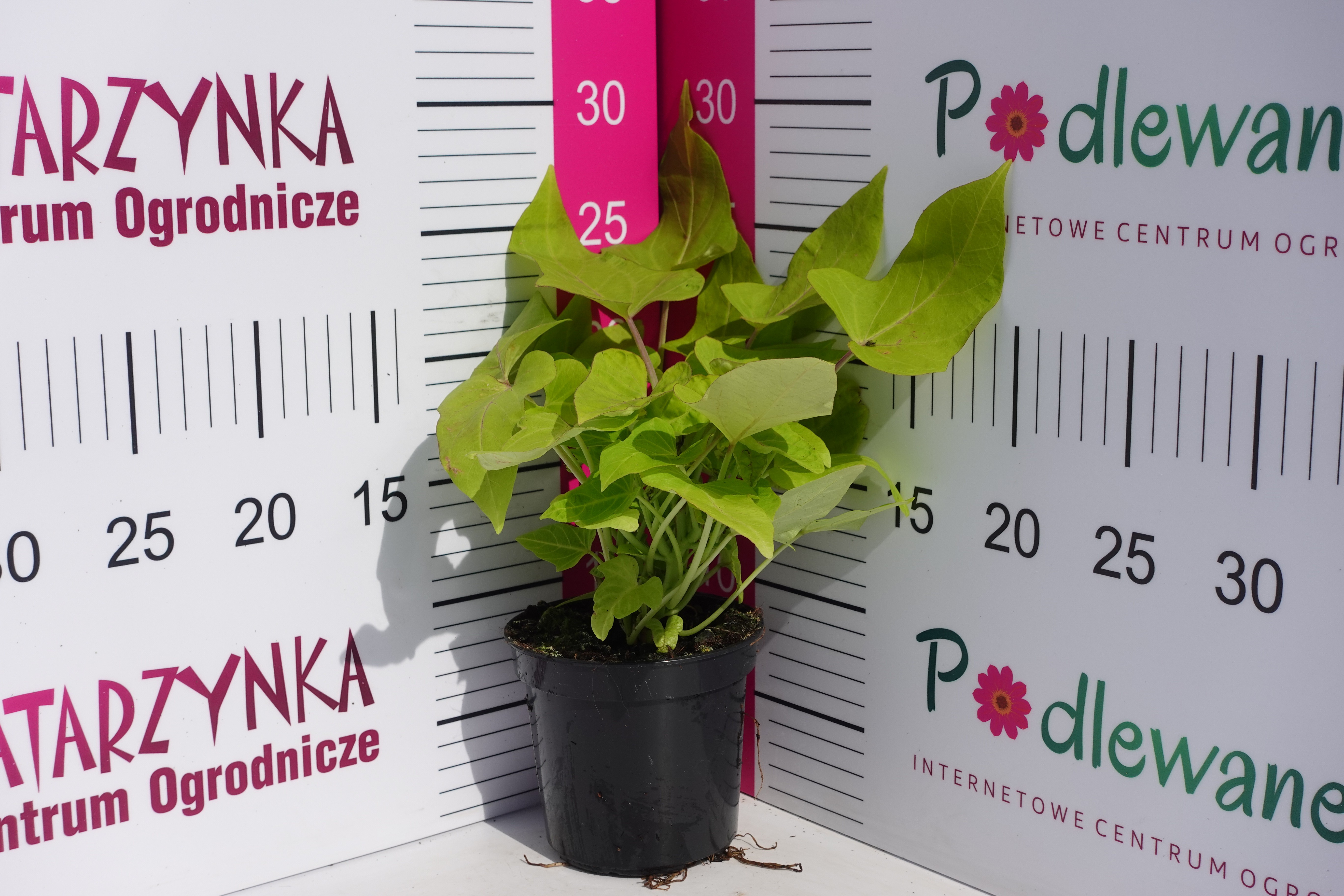 Soczysta fala świeżej zieleni! Ta wyjątkowo dekoracyjna roślina tworzy długie, przewieszające się pędy osiągające nawet 80–100 cm długości, budując gęste, miękkie kaskady liści. Duże, sercowate, delikatnie błyszczące liście zachwycają intensywną, energetyczną zielenią, która rozświetla kompozycje i pięknie kontrastuje z kwiatami innych roślin. W słońcu nabierają jeszcze większej świeżości, wprowadzając do aranżacji lekkość i naturalny wdzięk. Latem, w lipcu i sierpniu, pojawiają się urocze, fioletowo-różowe kwiaty, które subtelnie podkreślają jej egzotyczny charakter. To jednak bujna masa liści jest największą ozdobą – szybko zagęszcza się i tworzy efektowną, zieloną kurtynę spływającą z donic i skrzynek. Preferuje stanowiska słoneczne lub półcieniste, najlepiej rośnie na glebach żyznych, przepuszczalnych o odczynie lekko kwaśnym, może to być ziemia do roślin balkonowych o pH 5,5-6,8, dodatkowo można wymieszać ją z perlitem lub keramzytem, co spowoduje lepsze dotlenienie korzeni, a tym samym bujniejszy wzrost. Wymaga regularnego, obfitego podlewania oraz intensywnego nawożenia – źle znosi przesuszenie. W naszym klimacie uprawiana jako roślina jednoroczna, lecz jej bulwy można przechować na zimę. Idealna do donic, skrzynek balkonowych i pojemników wiszących. Doskonale sprawdzi się na balkonach, tarasach, pergolach i przy wejściach, gdzie tworzy świeże, soczyste kaskady zieleni przez cały sezon.