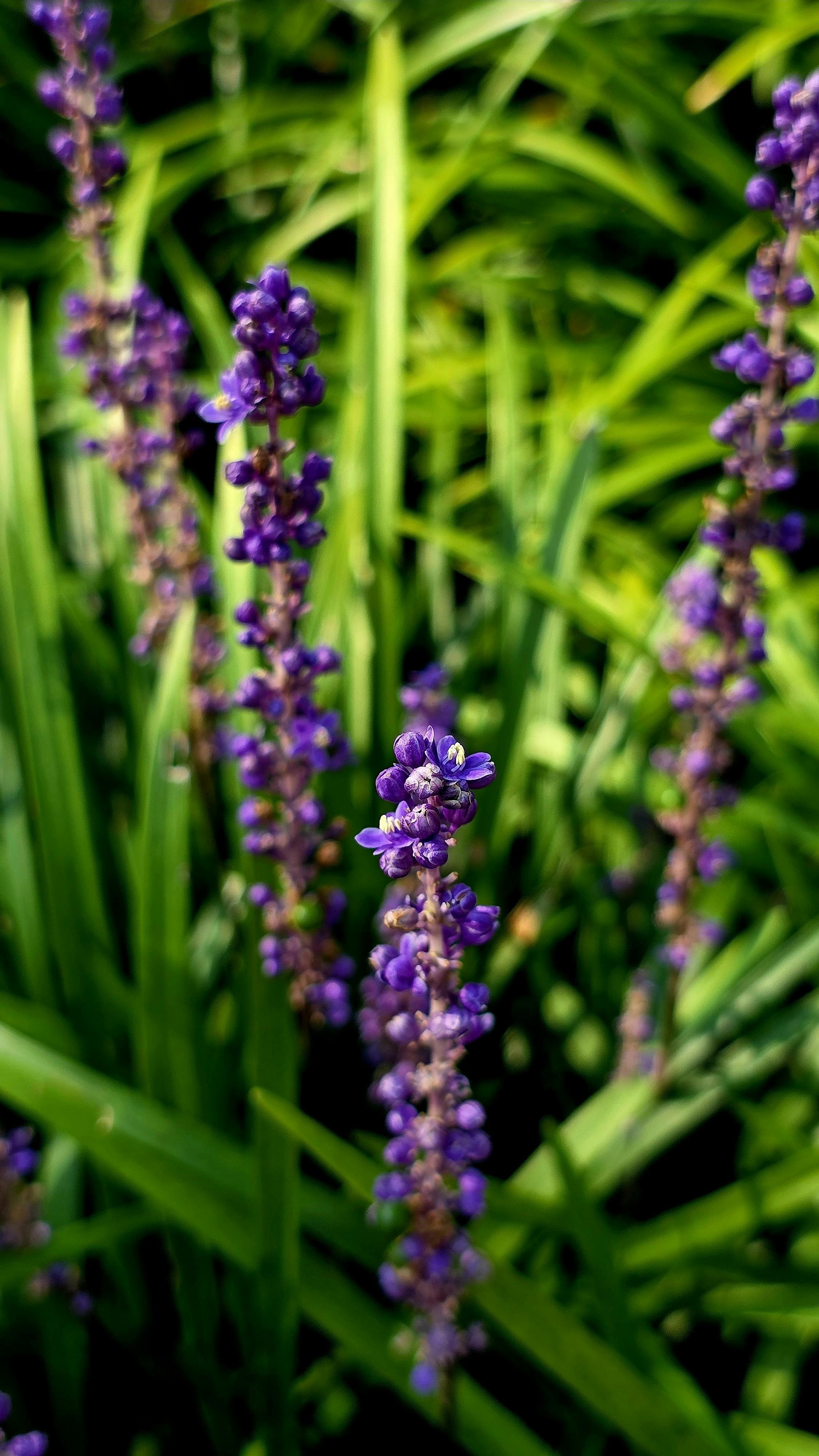 Perełka cienistych zakątków! Dorasta do 30 cm wysokości i szerokości, tworząc zwarte, powoli rosnące kępy dzięki krótkim kłączom. Liście wąskie, trawiaste, łukowato wyginające się na boki, zmieniają barwę wraz z porami roku – wiosną niemal białe, stopniowo przechodzą w szaro-zielone odcienie, a jesienią stają się intensywnie ciemnozielone, zachwycając nieustannie swoją metamorfozą. Od późnego lata pojawiają się gęste, intensywnie fioletowe kwiatostany, unoszące się tuż nad liśćmi niczym miniaturowe grona szafirków, które są miododajne i przyciągają owady, dodając ogrodowi życia i ruchu. Po przekwitnięciu roślina prezentuje dekoracyjne, prawie czarne jagody, utrzymujące się przez całą zimę. Odmiana łatwą w uprawie, najlepiej czuje się w półcieniu lub cieniu oraz na wilgotnym, żyznym, próchnicznym i przepuszczalnym podłożu o lekko kwaśnym odczynie, może to być ziemia uniwersalna ogrodowa o pH 5,5-6,5; najlepiej dodatkowo wymieszać ją z perlitem, co spowoduje lepsze dotlenienie korzeni, a tym samym bujniejszy wzrost. W chłodniejszych regionach warto osłonić ją na zimę, by wiosną znów zachwycała białymi przyrostami. Doskonale sprawdza się jako roślina okrywowa, na obwódki, do ogrodów leśnych, skalnych, a także do donic na balkony i tarasy, gdzie tworzy subtelne, eleganckie kompozycje. Rośliny uprawiane w donicach sadzimy w ogrodach przez cały sezon wegetacyjny, tj. od wczesnej wiosny, poprzez lato, aż do późnej jesieni.