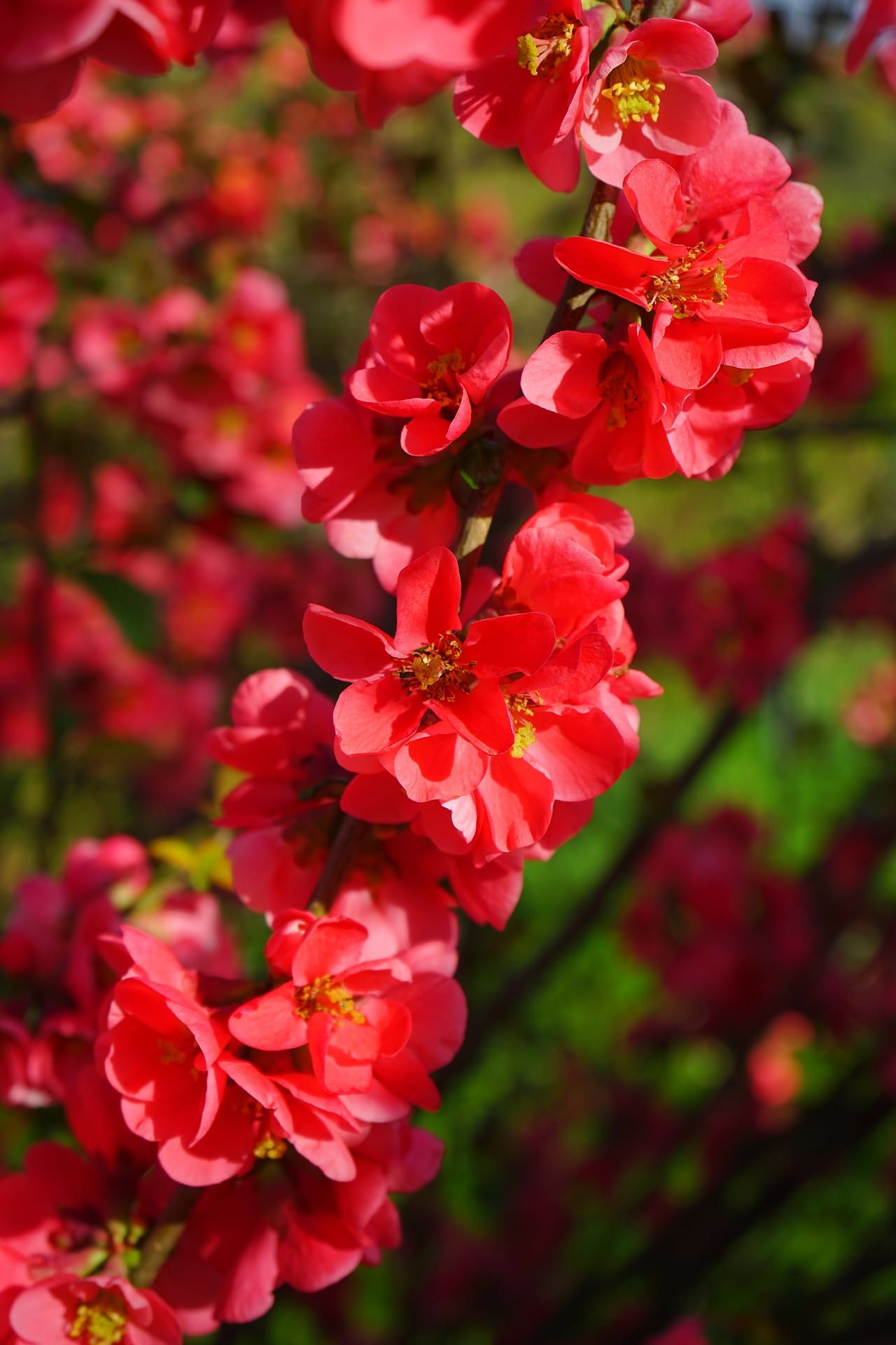 Ognista eksplozja wiosny, która rozświetla ogród od pierwszego spojrzenia! 'Fire Dance' to niski, szeroko rozrastający się krzew, dorastający po 10 latach do 1,2 m wysokości i nawet 2 m szerokości, o dynamicznej, gęstej formie. Pokładające się, cierniste pędy dodają mu charakteru, a liście świeże i zielone pięknie podkreślają spektakl kwiatów. W kwietniu krzew dosłownie eksploduje kolorem – pojawiają się liczne, pojedyncze kwiaty w jaskrawoczerwonym odcieniu, zebrane po kilka, z kontrastującymi żółtymi pręcikami. Efekt jest hipnotyzujący i widoczny z daleka. Jesienią pojawiają się kuliste, zielono-żółte owoce – twarde, aromatyczne i idealne na domowe przetwory, syropy czy naturalny dodatek do herbaty. Owoce są pełne witaminy C i naturalnych właściwości wzmacniających. Preferuje stanowisko słoneczne, gleby żyzne, przepuszczalne, przeciętne ogrodowe o odczynie lekko kwaśnym, może to być ziemia do drzewek i krzewów owocowych o pH 5,5-6,5; dodatkowo warto wymieszać ją z perlitem lub keramzytem, co spowoduje lepsze dotlenienie korzeni, a tym samym bujniejszy wzrost. Odmiana jest łatwa w uprawie, mrozoodporna i dobrze znosi susze, dzięki czemu sprawdzi się w ogrodach przydomowych i nasadzeniach miejskich. Idealna do sadzenia pojedynczo, w grupach, na rabatach, skarpach oraz w ogrodach skalnych – wszędzie tam, gdzie chcesz wprowadzić efekt "WOW" już od pierwszych dni wiosny. Rośliny uprawiane w donicach sadzimy w ogrodach przez cały sezon wegetacyjny, tj. od wczesnej wiosny, poprzez lato, aż do późnej jesieni.
