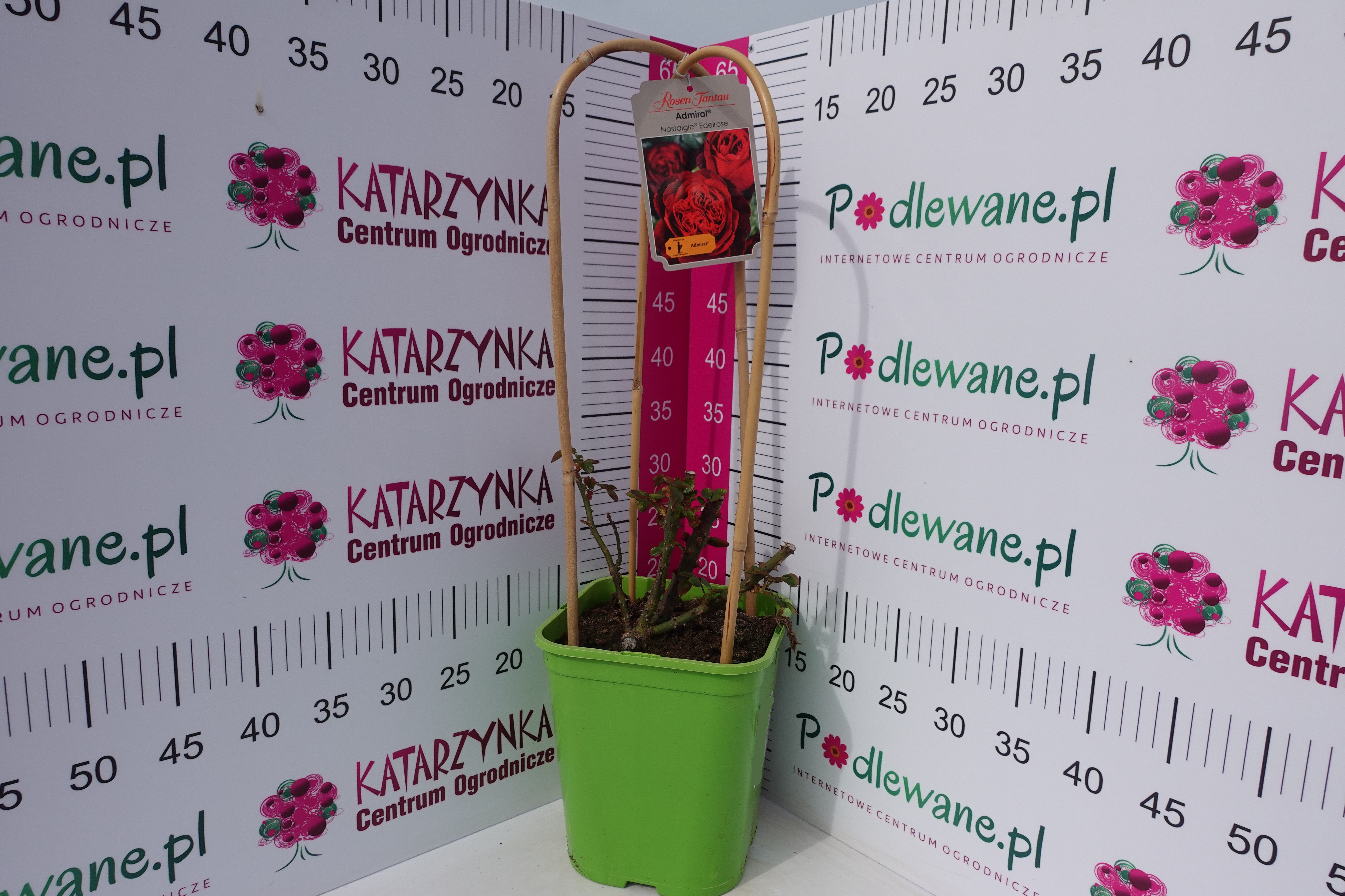 Róża nostalgiczna ‘Admiral’ to kwintesencja klasycznej elegancji i romantycznego uroku – odmiana, która zachwyca od pierwszego pąka aż po ostatni jesienny kwiat. Tworzy silny, wzniesiony i gęsty krzew dorastający do 1,2 m wysokości i 0,6 m szerokości, idealny do ogrodów z charakterem. Długie, sztywne i proste pędy są tylko delikatnie kolczaste, dzięki czemu róża doskonale sprawdza się również na kwiat cięty. Ciemnozielone, skórzaste i lśniące liście podkreślają luksusowy wygląd krzewu i stanowią perfekcyjne tło dla zjawiskowych kwiatów. Kwitnienie powtarza się falami od lata aż do jesieni, a każdy kwiat to małe dzieło sztuki – niemal czarne pąki rozwijają się w ogromne, intensywnie czerwone kwiaty o średnicy nawet 14 cm! Początkowo szlachetne i klasyczne, z czasem przybierają formę czarki, by ostatecznie rozwinąć się w luźną, romantyczną rozetę. Kwiaty są bardzo pełne i osadzone pojedynczo na pędach, a ich intensywny, słodki i zmysłowy zapach wypełnia ogród elegancją. Preferuje stanowiska słoneczne, gleby żyzne, przepuszczalne, umiarkowanie wilgotne o odczynie lekko kwaśnym, może to być podłoże do róż o pH 5,5-6,5; najlepiej dodatkowo wymieszać je z perlitem, co spowoduje lepsze dotlenienie korzeni, a tym samym bujniejszy wzrost. Regularne podlewanie, nawożenie w okresie wegetacyjnym oraz coroczne cięcie pozwolą na zdrowy rozwój rośliny i obfite kwitnienie. W chłodniejszych rejonach zaleca się lekkie okrycie podstawy krzewu na zimę. To róża stworzona do ogrodów przydomowych, parkowych rabat oraz miejsc reprezentacyjnych – prawdziwa perła wśród róż nostalgicznych. Róża 'Admiral'® należy do ekskluzywnej serii róż nostalgicznych – cenionej za pełne, romantyczne kwiaty o wyjątkowej urodzie. Rośliny uprawiane w donicach sadzimy w ogrodach przez cały sezon wegetacyjny, tj. od wczesnej wiosny, poprzez lato, aż do późnej jesieni.