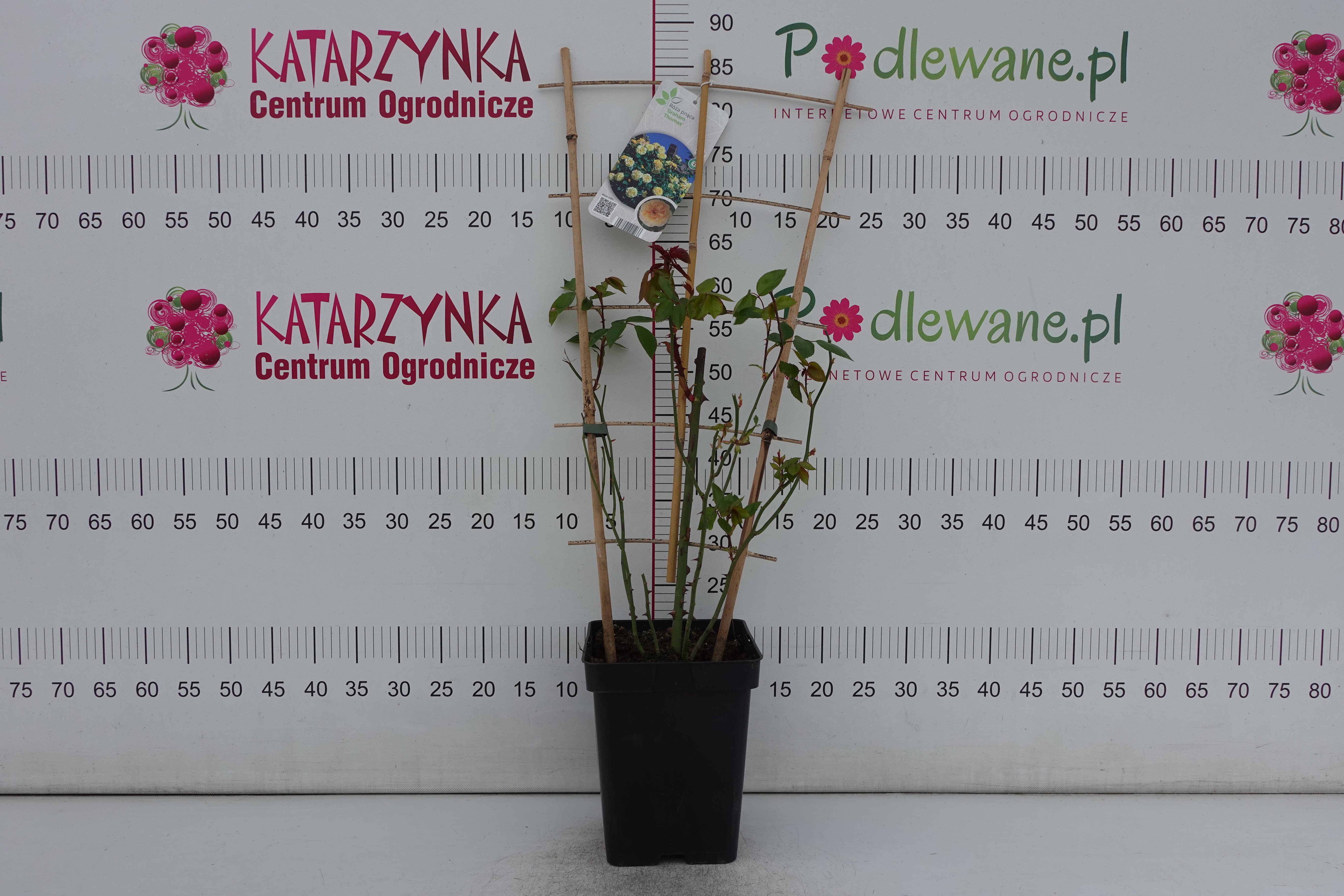 Róża pnąca ‘Graham Thomas’ to prawdziwa ikona elegancji, która wnosi do ogrodu ciepło słonecznych, złocistych kwiatów i ponadczasowy urok. Ta wyjątkowa odmiana zachwyca bujnym, silnym wzrostem i gęstym pokrojem, dorastając do 3,5 m wysokości i tworząc efektowne, kwitnące formy idealne na pergole, altany i ogrodzenia. Mocne, elastyczne pędy łatwo się prowadzą, a ciemnozielone, błyszczące liście stanowią doskonałe tło dla dużych, pełnych kwiatów w herbaciano-żółtym odcieniu, przypominających kształtem piwonie. Kwitnie długo i bardzo obficie od czerwca aż do października, wypełniając ogród intensywnym, przyjemnym zapachem. Kwiaty są trwałe, odporne na deszcz i piękne również po ścięciu. Najlepiej rośnie na stanowiskach słonecznych, w żyznej i przepuszczalnej glebie o lekko kwaśnym odczynie, może to być podłoże do róż o pH 5,5-6,5; najlepiej dodatkowo wymieszać je z perlitem, co spowoduje lepsze dotlenienie korzeni, a tym samym bujniejszy wzrost. Regularne podlewanie i nawożenie w sezonie wegetacyjnym sprzyja intensywnemu kwitnieniu. W chłodniejszych rejonach zaleca się lekkie okrycie podstawy krzewu na zimę. To odmiana ceniona za urodę, długowieczność i niezawodność – idealna dla tych, którzy marzą o ogrodzie pełnym klasy, światła i romantycznego klimatu. Rośliny uprawiane w donicach sadzimy w ogrodach przez cały sezon wegetacyjny, tj. od wczesnej wiosny, poprzez lato, aż do późnej jesieni.
