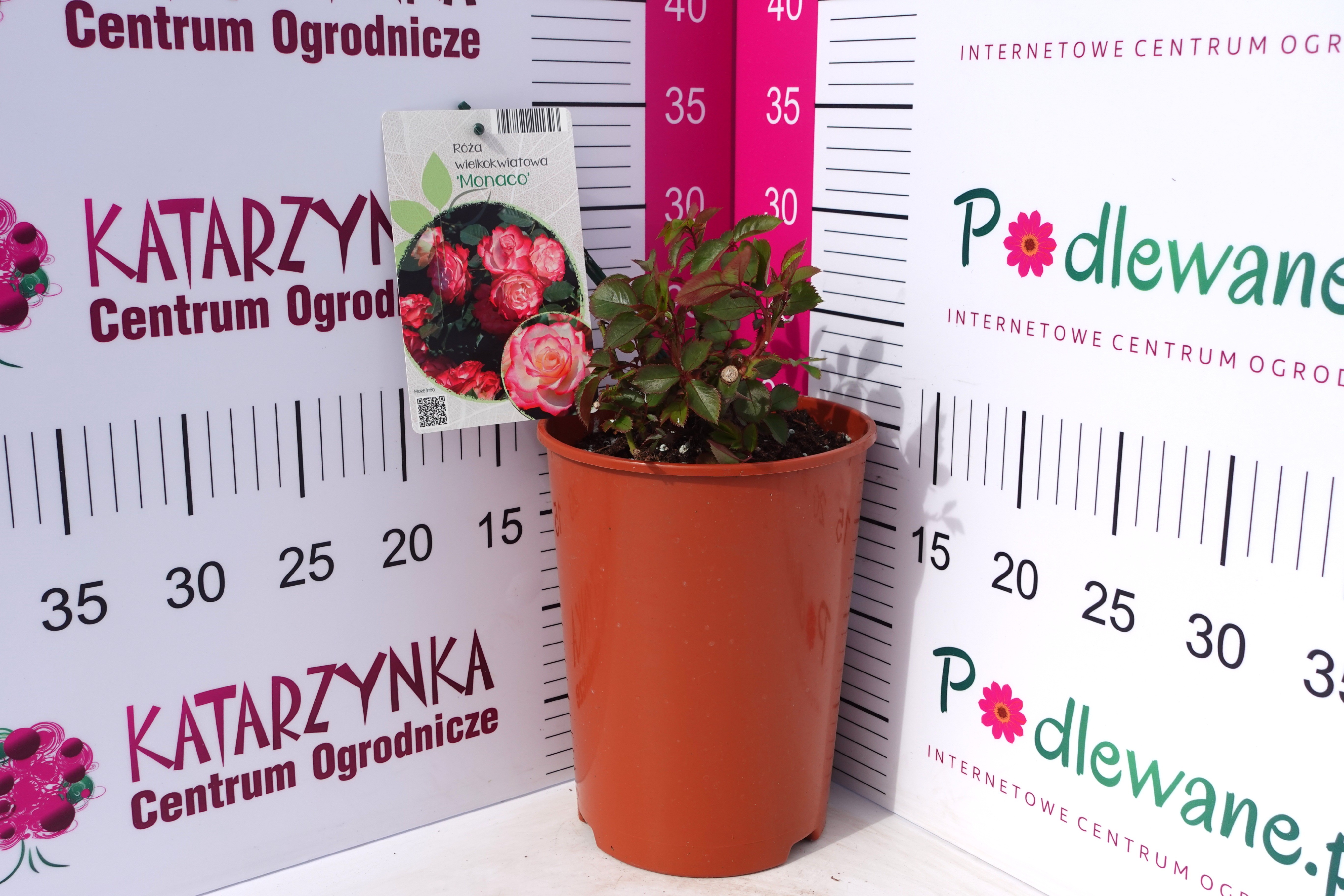 Królowa rabat, której nie sposób przeoczyć! 'Monaco' dorasta do 120 cm wysokości i 60 cm szerokości, tworząc pełny, wzniesiony krzew. Liście błyszczące, jasnozielone, pięknie kontrastują z bajeczną kolorystyką kwiatów. Jej pełne, kremowo-różowe kwiaty układają się w perfekcyjne rozety, a subtelny, owocowy zapach roztacza w ogrodzie niezwykłą aurę romantyzmu. Kwitnie obficie od czerwca do października, a kilkuletnie krzewy potrafią wydać nawet do 200 kwiatów w sezonie! Ta odmiana to prawdziwy festiwal barw i aromatu – kwiaty rozwijają się jeden po drugim, wprowadzając nieustanną grę odcieni i kształtów. Po sezonie ozdabiają ją dekoracyjne, pomarańczowe owocostany, tzw. szypułki. Odmiana wyróżnia się niezwykłym wigorem kwitnienia, odpornością na choroby oraz łatwością w pielęgnacji. Preferuje stanowiska słoneczne, gleby żyzne, przepuszczalne, umiarkowanie wilgotne o odczynie lekko kwaśnym, może to być podłoże do róż o pH 5,5-6,5; najlepiej dodatkowo wymieszać je z perlitem, co spowoduje lepsze dotlenienie korzeni, a tym samym bujniejszy wzrost. Doskonale sprawdza się na rabatach, w pojemnikach na balkonach i tarasach, a jej kwiaty idealnie nadają się do bukietów, wprowadzając elegancję i czar w każde wnętrze. Rośliny uprawiane w donicach sadzimy w ogrodach przez cały sezon wegetacyjny, tj. od wczesnej wiosny, poprzez lato, aż do późnej jesieni.